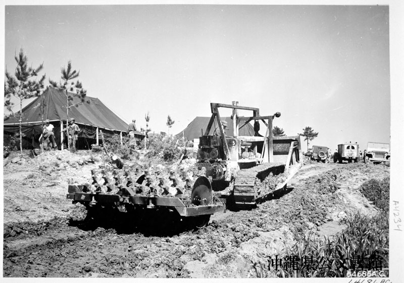 【和訳】 滑走路建設予定地で地ならし機を運転する第1878工兵航空大隊隊員。沖縄。