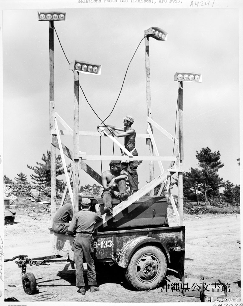 【和訳】 夜間の作業のため投光照明を装備する第1878工兵航空大隊の電気技術士。沖縄。
