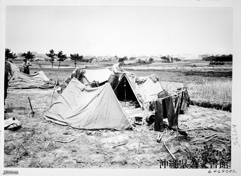 【和訳】 キャンプ区域にテントを張る第1878工兵航空大隊隊員。沖縄。