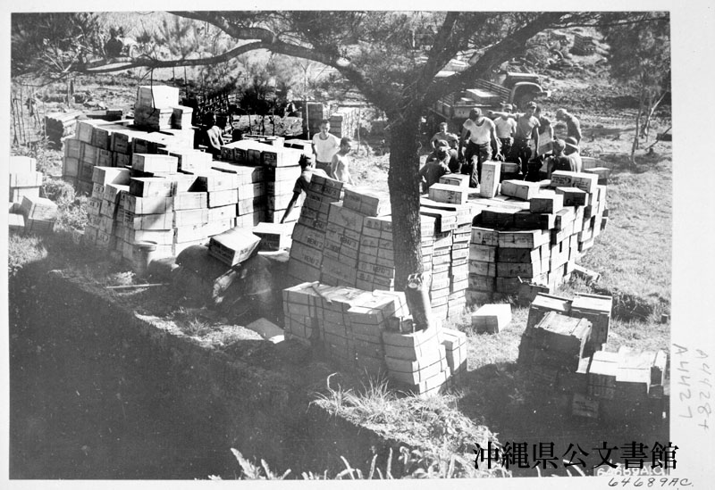 【和訳】 臨時集積所で箱を積む第1878工兵航空大隊隊員。沖縄。