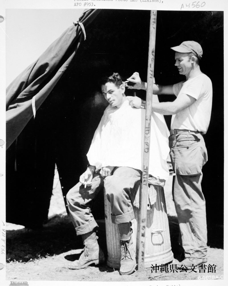 【和訳】 第443工兵航空大隊のクラム伍長は非番の時には米兵たちの散髪をする。沖縄。