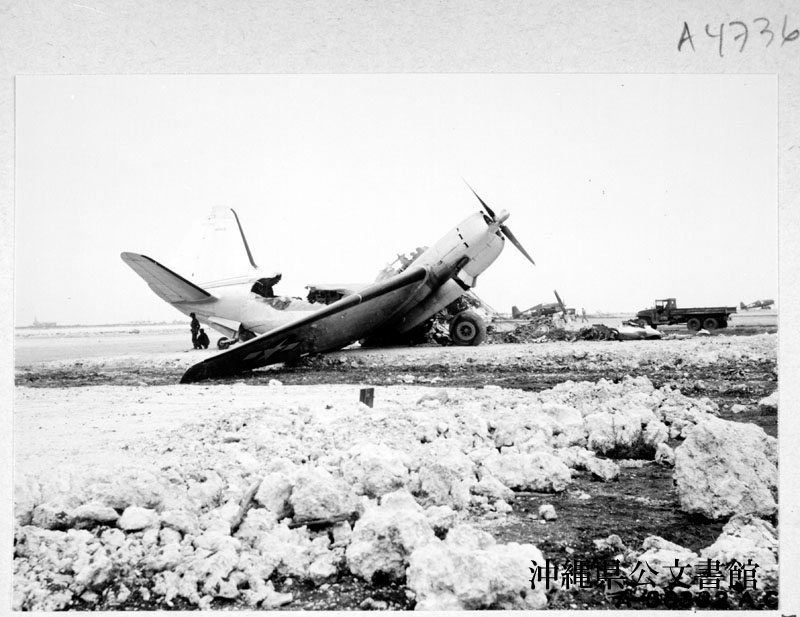 【和訳】 1945年5月24日に読谷飛行場で日本軍の攻撃を受けた米国航空機の残骸。12機の飛行機が、着陸して手榴弾や磁気機雷、迫撃砲などあらゆる爆発物を用いて航空機を破壊するのを試みた。生き残った日本兵はC-46(輸送機)を2機、C-47を1機、C-54を1機、PB4Y2(爆撃機)を1機そして数機の戦闘機を破壊した。