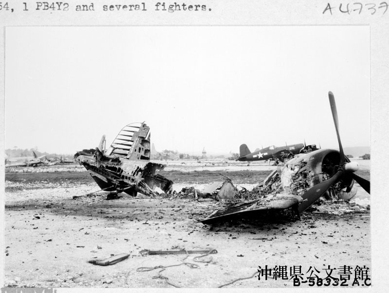 【和訳】 1945年5月24日に読谷飛行場で日本軍の攻撃を受けた米国航空機の残骸。12機の飛行機が、着陸して手榴弾や磁気機雷、迫撃砲などあらゆる爆発物を用いて航空機を破壊するのを試みた。生き残った日本兵はC-46(輸送機)を2機、C-47を1機、C-54を1機、PB4Y2(爆撃機)を1機そして数機の戦闘機を破壊した。
