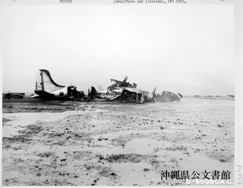 【和訳】 1945年5月24日夜の読谷飛行場への日本軍による空襲の後に撮影した米軍機の残骸。唯一地上近くまできた日本軍特攻機「サリー」を送り出した爆破部隊によっていくらかの被害を受けた。