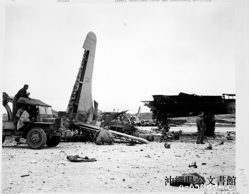 【和訳】 1945年5月24日夜の読谷飛行場への日本軍による空襲の後に撮影した米軍機の残骸。唯一地上近くまできた日本軍特攻機「サリー」を送り出した爆破部隊によっていくらかの被害を受けた。