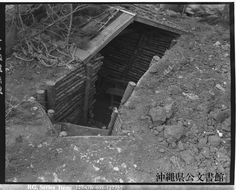 【和訳】 読谷飛行場の東100ヤードの地点にある大型高射砲員用防空壕の入り口。