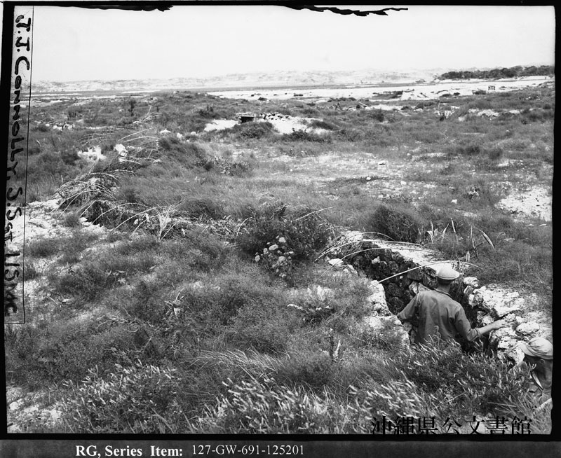 【和訳】 那覇飛行場隣の海岸に面した日本軍の塹壕。後方に見える那覇飛行場と塹壕自体の構造に注目。