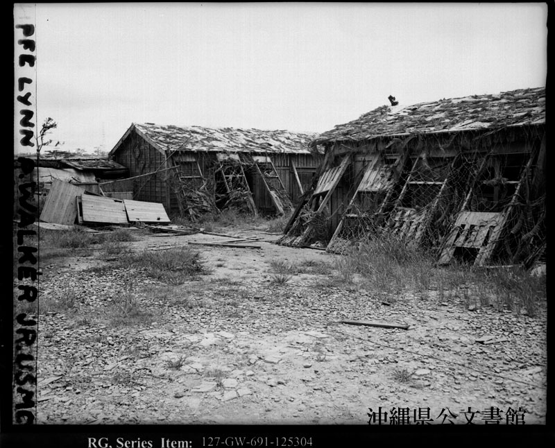 【和訳】 奥武山島--奥武山島にあるバラック小屋。奥武山島は那覇港にあり、那覇市民の憩いの場で、神社や手頃な商店もあった。このバラック小屋は、おそらく港湾部隊所属の海軍兵士の兵舎だろう。