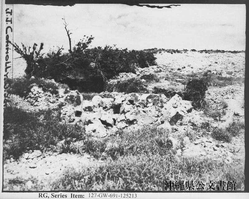 【和訳】 那覇飛行場の南西にある丘の斜面から海側を望む。この丘にはいくつもの壕があり、砲座が設置されている。那覇飛行場を目標にした上陸作戦に対抗するための防衛拠点の1つとして考えられていた。