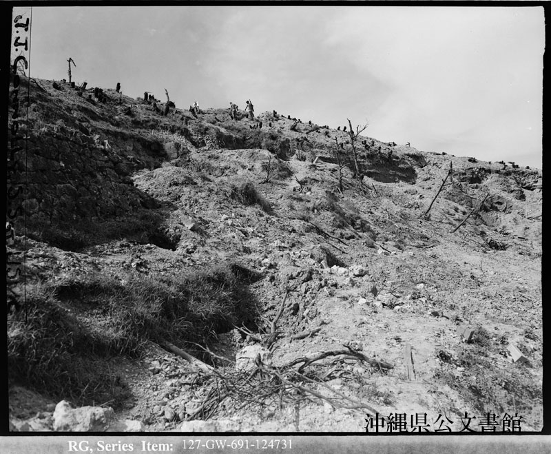 【和訳】 西側のふもとから見た“シュガーローフ・ヒル”。絶え間ない日本軍の手榴弾攻撃と迫撃砲火にさらされながら、海兵隊は丘の斜面を猛攻撃し頂上を攻略しようとした。この丘自体も多くの砲弾を浴び、地表は絶えず崩れた。夜間に壕を掘っていた人が埋まることもよく起きた。