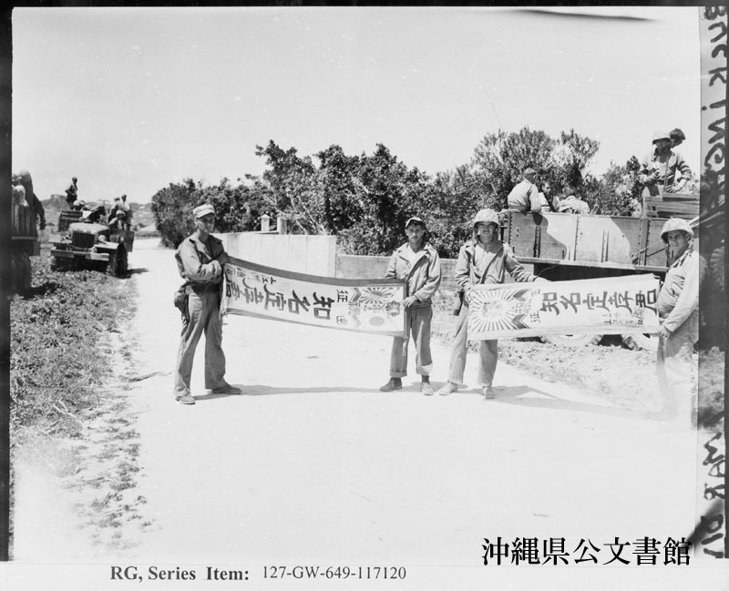 【和訳】 戦闘が続く中で--(左から)ベック1等軍曹(イリノイ州出身)。彼はニューブリテン島とペリリュー島の戦いに従軍していた。ドーセット伍長(カリフォルニア州出身)。ボーマン伍長(インディアナ州出身)もニューブリテン島とペリリュー島にいた。バーツ伍長(ノースカロライナ州出身)もニューブリテン島とペリリュー島で従軍。旗は、日本の靴屋と食料品店の宣伝のぼり。