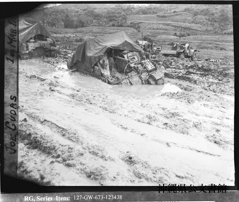 【和訳】 ほぼ砲身の高さまで泥に埋まった戦車。105ミリ榴弾砲。