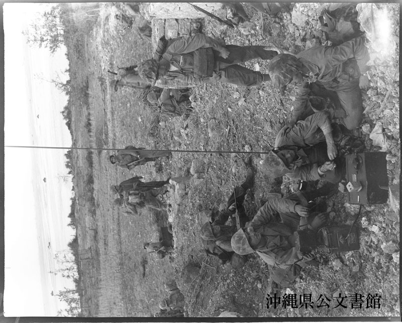 【和訳】 海岸に設営した最初の無線機を操作するマッケルベニー1等兵とジョーンズ1等兵、バーンスタイン伍長。3人とも第1海兵師団第5連隊第2大隊の中隊司令部所属。