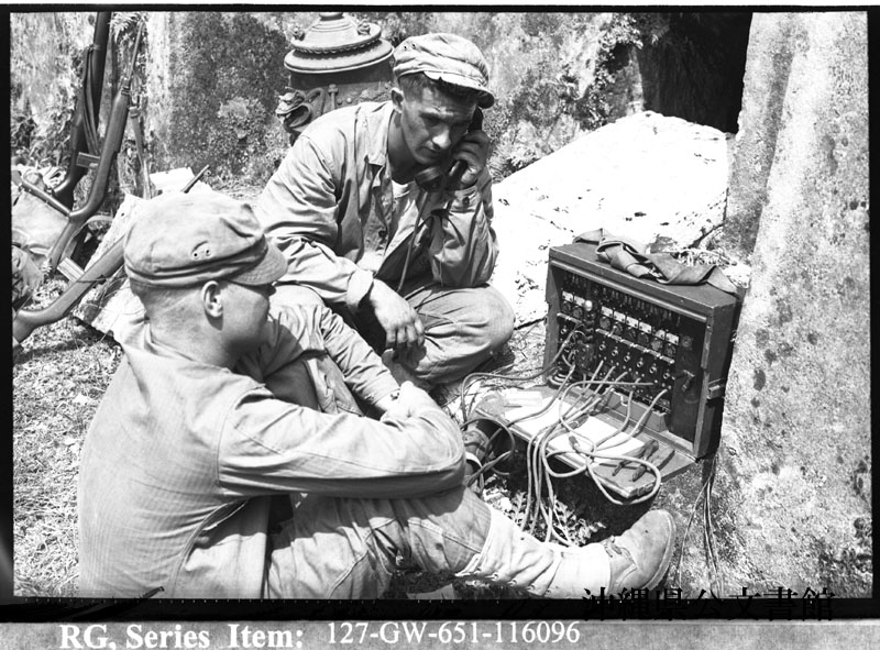 【和訳】 亀甲墓の前に置かれた野外電話機。後方にあるのは骨壺。