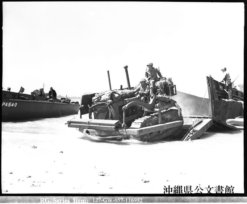 【和訳】 ヒギンズ型船(LCVP)から陸揚げされたブルドーザー。