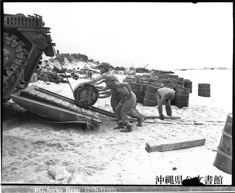 【和訳】 海岸から燃料のドラム缶を移動させる。
