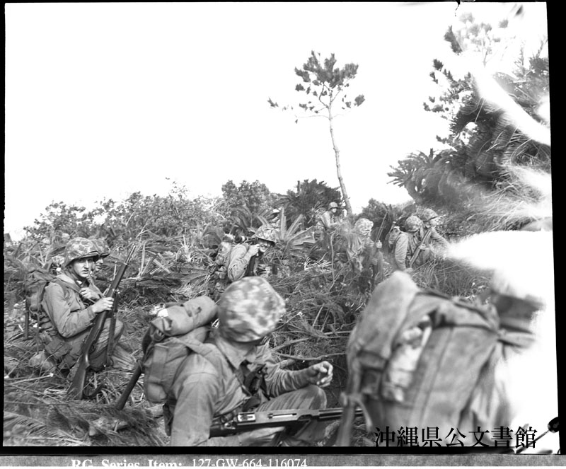【和訳】 “ブルービーチ2”と“ブルービーチ1”の全景。“ブルービーチ2”と“ブルービーチ1”とは、第1海兵師団の上陸した地域を指す暗号である。長い護岸は海軍の猛攻撃で破壊された。日本軍は丘に退いた。海兵隊員と機材はほとんど被害なく海岸にたどり着いた。