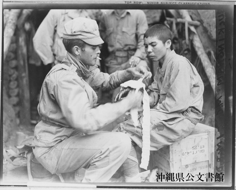 【和訳】 偵察部隊司令部に運ばれた日本兵を手当てする偵察部隊衛生下士官フィップPhM2/c。フィップはニュー・ブリテン島とペリリュー諸島での戦争を経験している。フィップはヘンプステッド高校を出てFalasisにおいて部隊表彰を受けた。