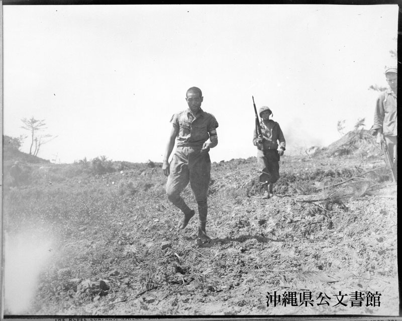 【和訳】 防空壕からよろめきながら出てきて、海兵隊員によって列に戻される日本兵。