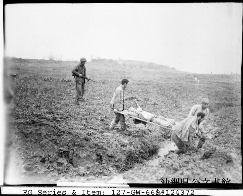 【和訳】 日本人もまたぬかるみを嫌う。海兵隊第1連隊隊員がずぶぬれのまま監視する中、3人の日本兵が負傷した仲間の狙撃兵を運び沖縄本島首里城を囲むぬかるみを通る。この4人は、補給品をかつぎ2マイルを歩いてへとへとになった海兵隊員の列に向けて発砲した後、洞穴で捕らえられ投降した。海兵隊員らは首里城で日本軍の反撃に対抗しようと構える仲間へ食糧を運ぶところだった。