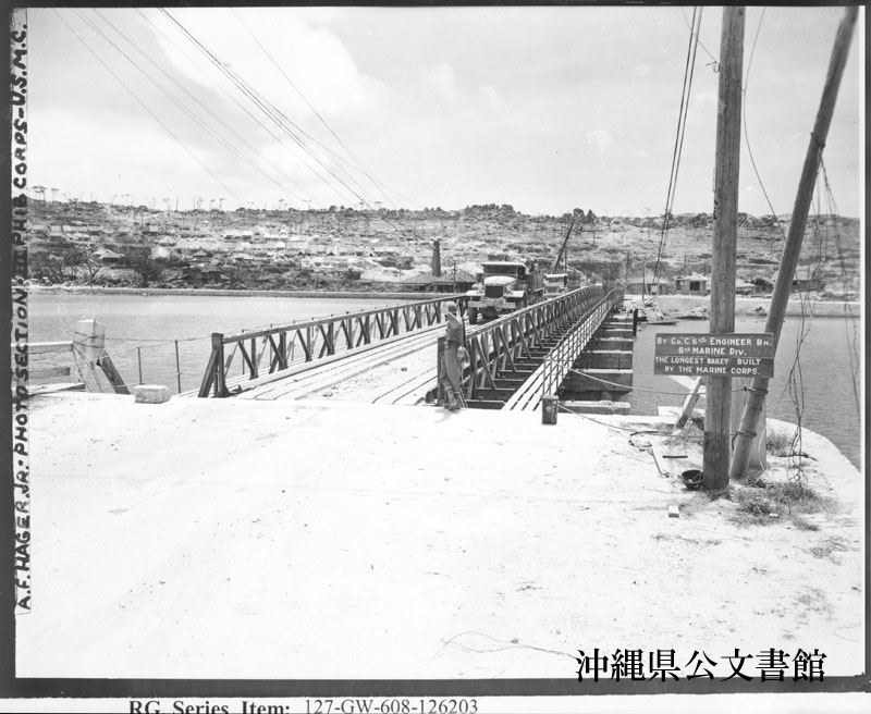 【和訳】 奥武山島‐‐那覇から奥武山にかけられたベーリー橋。(米)海兵隊によって建てられたベーリー橋の中で最長のもの