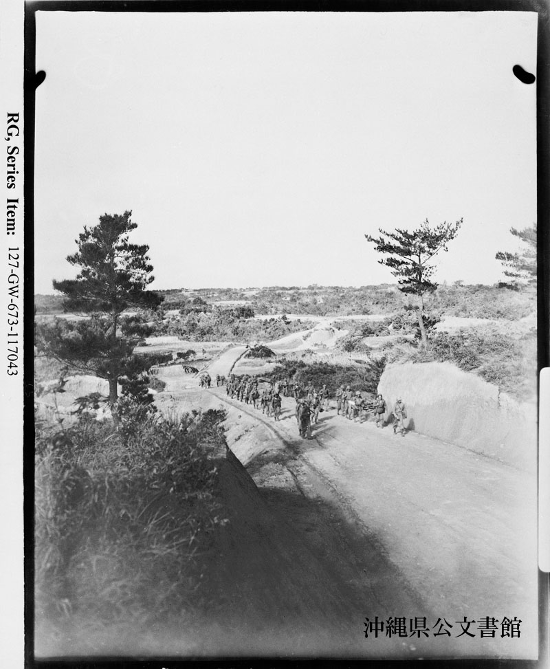 【和訳】 沖縄島の内陸部を進軍する第5海兵連隊。