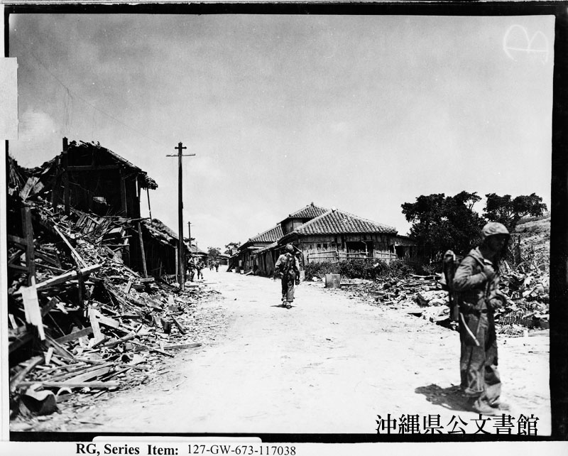 【和訳】 放棄された大湾読谷村)を進軍する第1海兵師団第5連隊。