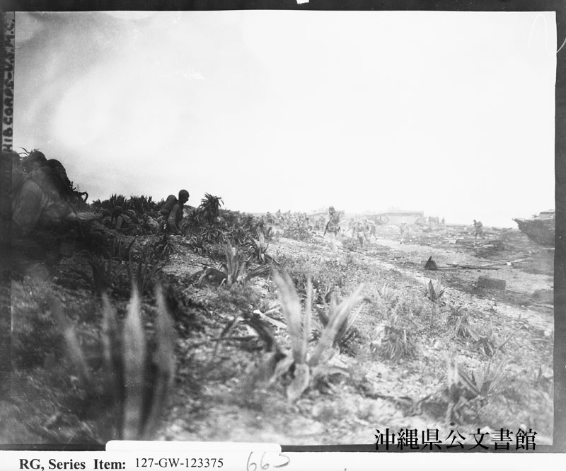 【和訳】 小禄半島レッドビーチに沿った丘陵の道を進む兵士
