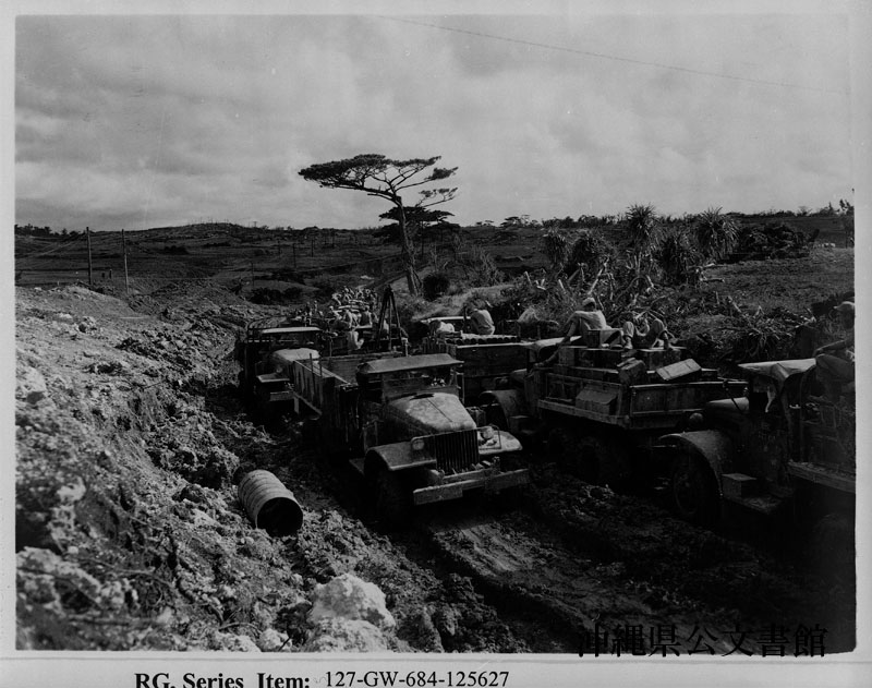 【和訳】 ぬかるんだ泥道に激しい車の往来でできた轍(わだち)を踏んで1号線を行き交う車両。