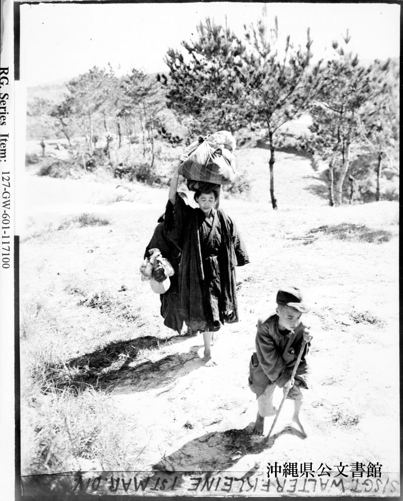 【和訳】 海兵隊に降伏し、所持品を持って山から降りてくる地元の人々