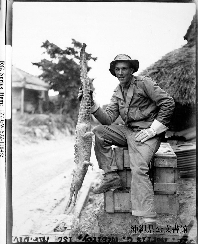 【和訳】 沖縄で見つけたワニの剥製を持つディズニー海兵隊1等兵