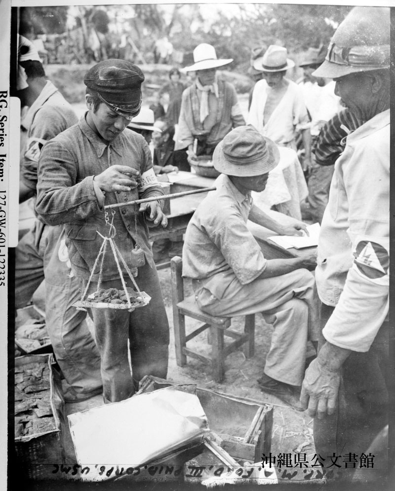 【和訳】 地元のはかりで計量された食糧は、海兵隊民政キャンプで働いている人々に配給される
