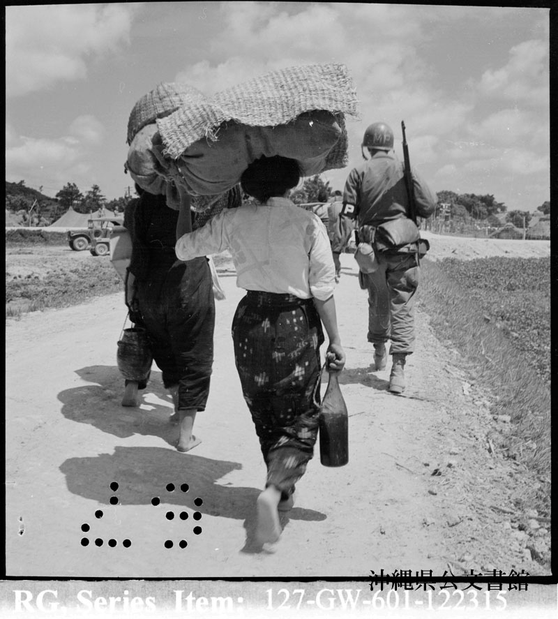 【和訳】 カッチン(勝連)半島の収容所へもんぺ姿の沖縄人少女を案内する憲兵