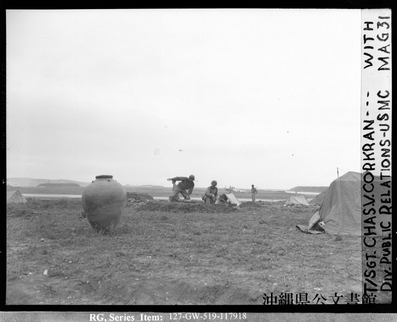 【和訳】 読谷飛行場西側滑走路沿いに軍営をはるホワイト少佐率いる「ブラックジャック」隊。第2海兵航空団が読谷飛行場に進駐したとき先鋒部隊となったのがこの隊だった