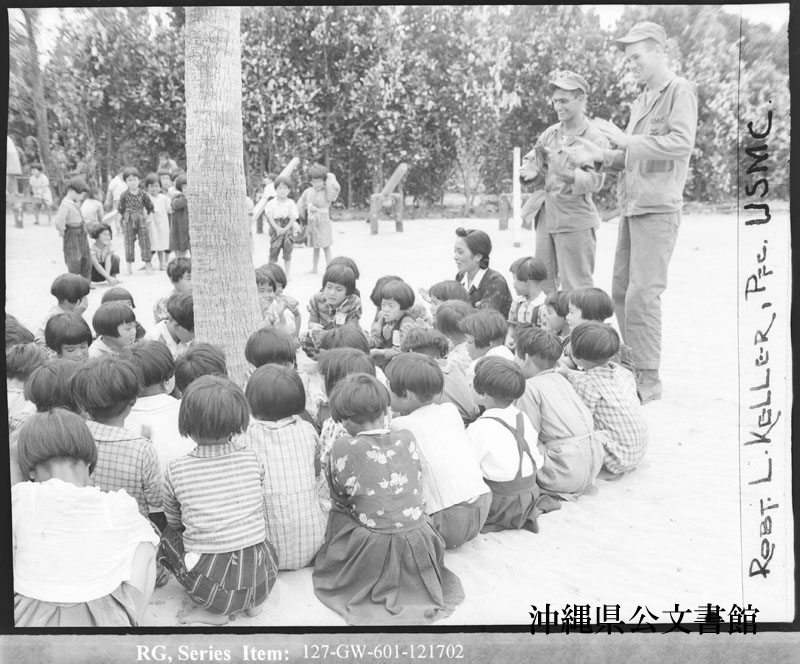 【和訳】 輪になって遊んでいる地元の子供。海兵隊員が見ている