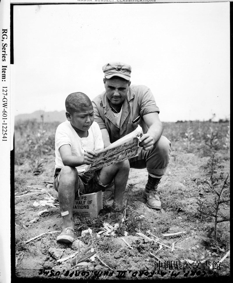 【和訳】 米海兵隊所属カーベル中尉が読む続き漫画を楽しむ沖縄の少年。