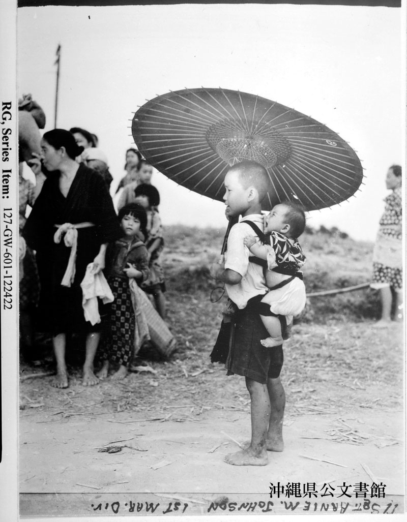 【和訳】 ここにいる沖縄の地元民は道の向こうにあるものに興味を示しているが、兄の背中におぶられているこの小さな子は、家に帰りたがっている