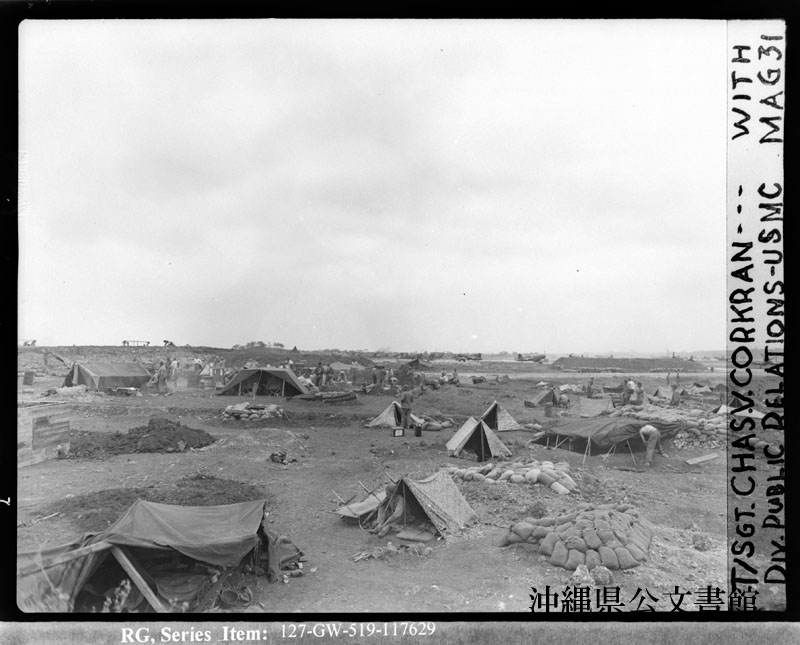 【和訳】 読谷飛行場はずれにすぐにキャンプを張る第2海兵隊航空団の地上部隊とパイロットからなる「ブラックジャック」隊。新しく手に入れた日本軍基地から作戦を展開したのはこの隊が初めてである
