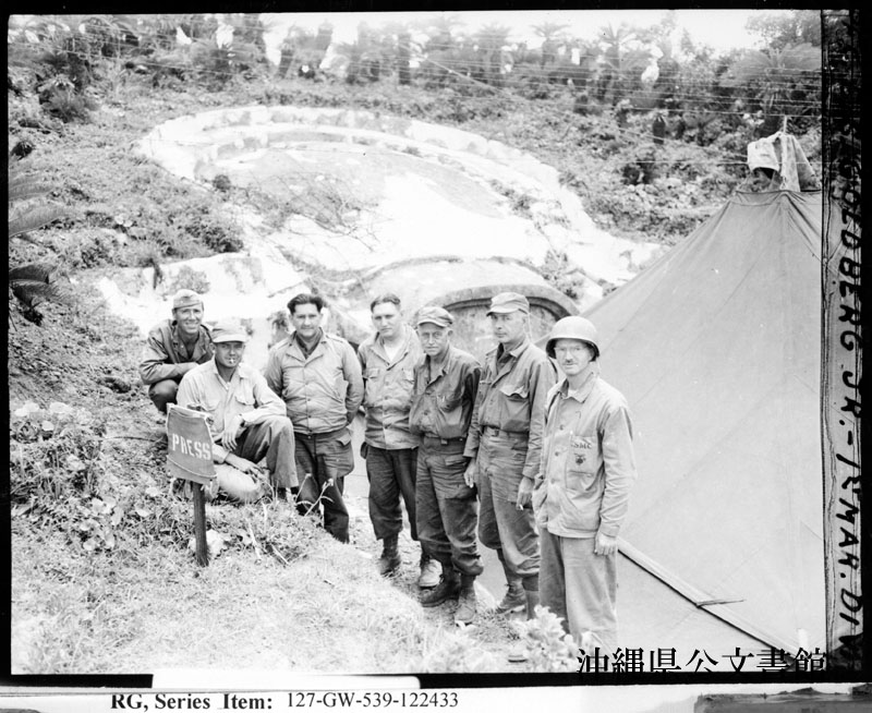 【和訳】 首里前線の墓の前にて。左から第1海兵師団広報担当のバルマン少尉、他は従軍記者