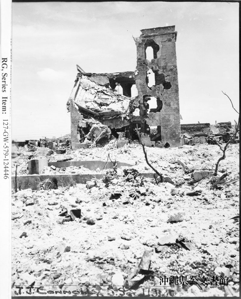 【和訳】 石材・鉄筋建築の爆撃被害を検証。建物が一部崩壊している様子に注目。海からの砲撃を直に受け、傷を残している