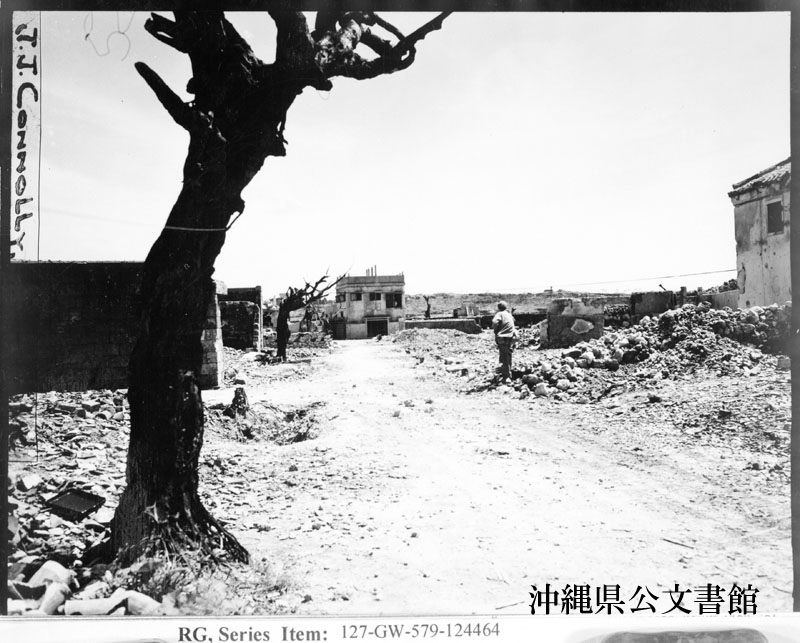 【和訳】 廃墟と化した那覇の街のある通り。かつて整然と建物が並んでいたが、現在は外壁だけがかろうじて持ちこたえていることに注目
