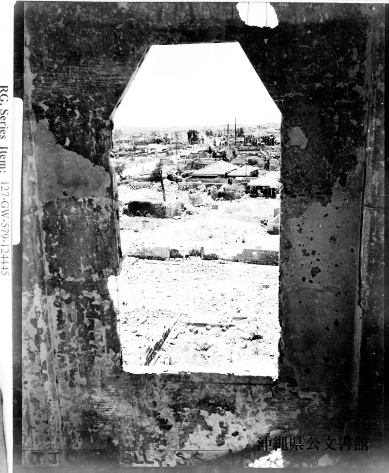 【和訳】 那覇の破壊された建物の中からの眺め。爆撃にもかかわらず、典型的な住宅構造の外観が残っている