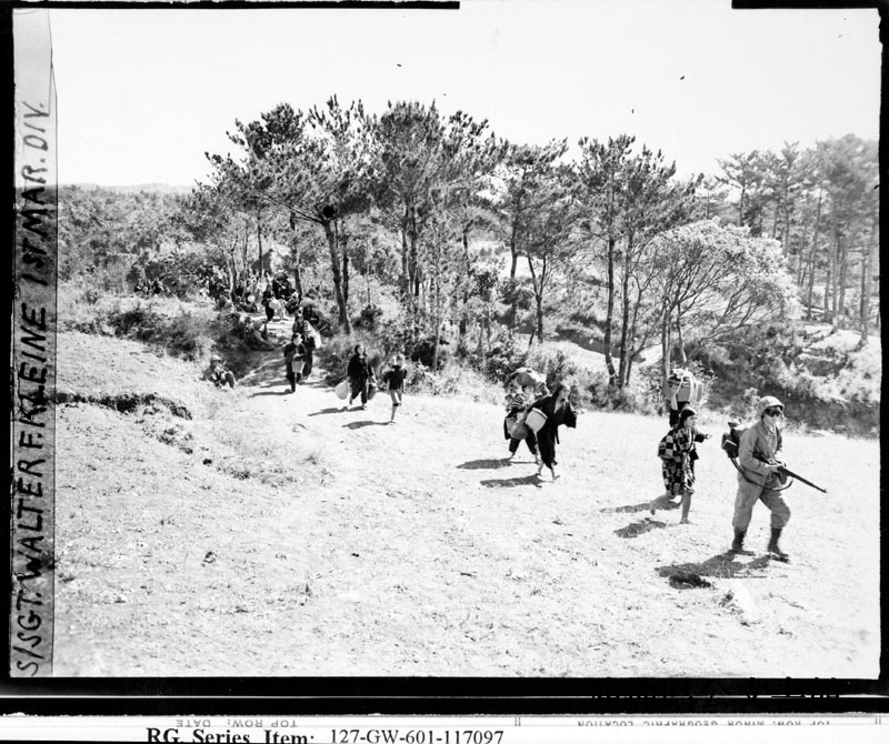 【和訳】 海兵隊に降伏し、隠れていた山から出てくる沖縄の人々