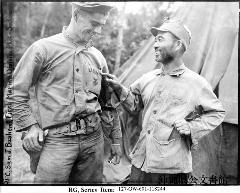 【和訳】 海兵隊員にダンガリーをもらってご機嫌の地元の教師「パンチョ」(右)。隣はラチュノック伍長