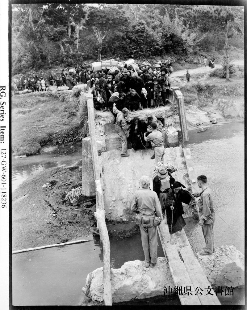 【和訳】 壊れた橋を渡る沖縄の人々に手を貸す第1海兵師団。海兵隊駐留のもう一つの理由は、民間人を戦闘地域から移動させ、収容することである