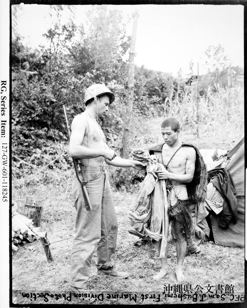 【和訳】 カヨタ一等兵からダンガリーをもらう地元民。彼は蓑(みの)をまとっている