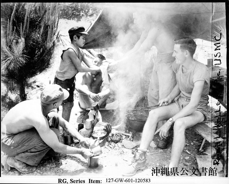【和訳】 避難民の男の子に食べ物を与えている海兵隊員。ラ・デュー2等兵、ファーンワース伍長、ワトソン1等兵、バーガー1等兵。