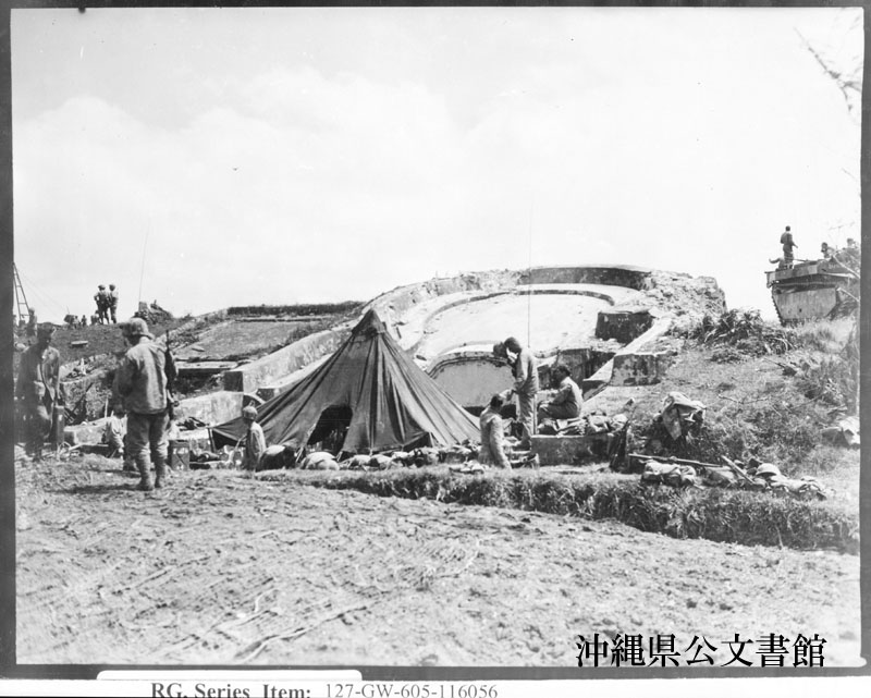 【和訳】 野営地:地元の墓の前に野営地を設ける在沖海兵隊員。第1、第6海兵師団は、日本本土からわずか325マイル(約523km)の距離にある琉球列島への侵攻に参戦すると伝えられている