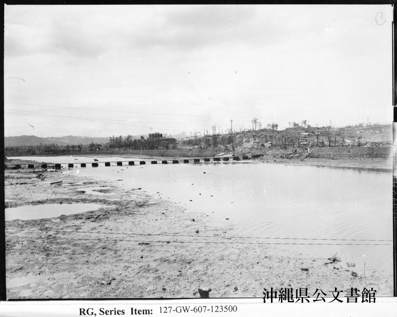【和訳】 安謝川‐‐泥湿地、軟底、そして川の全体像や、川を渡るための仮設橋が見える