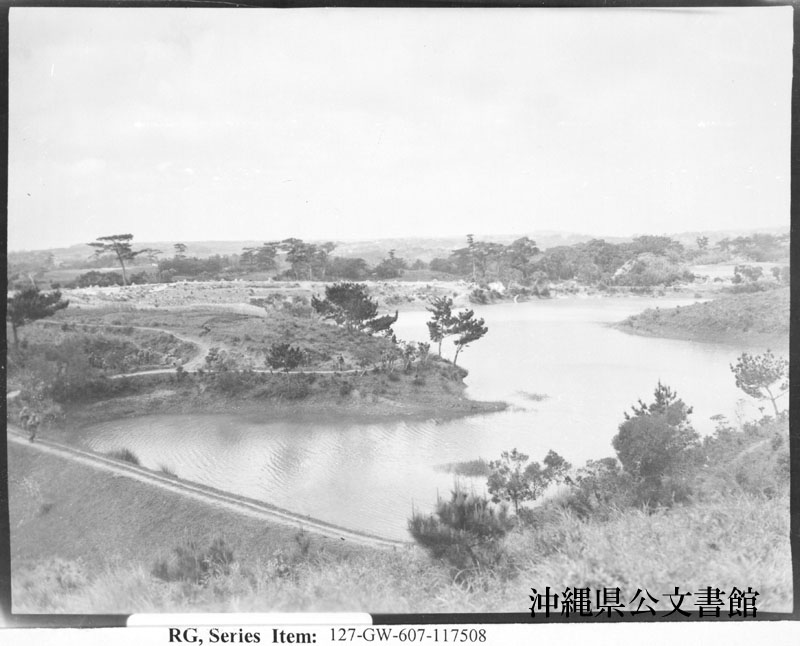 【和訳】 沖縄の灌漑システムの一部である貯水池をつくるダムと(その)ダムを渡る海兵隊員
